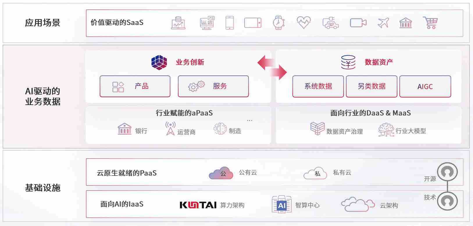 数字时代,,,围绕企业数字化转型的关键要素,,,,菠菜论坛数码开创性的提出数云融合战略和技术体系框架,,,,着力在云原生、、数字原生、、、、AI原生和信创产业上架构产品和服务能力,,,,为处在不同数字化转型阶段的快消零售、、、、汽车、、、金融、、医疗、、政企、、教育、、运营商等行业客户提供泛在的敏捷IT能力和融合的数据驱动能力,,,构建跨界融合创新的数字业务场景和新业务模式,,,,助力企业级客户建立面向未来的核心能力和竞争优势,,,,全面推动社会的数字化、、智能化转型升级。。